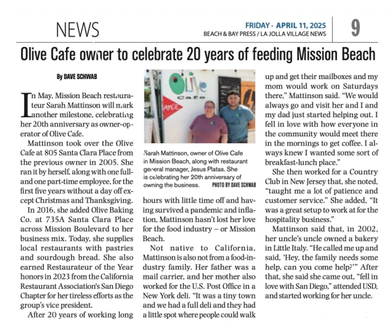 Olive Cafe and Olive Baking Company owner Sarah Mattinson celebrates a huge milestone in Mission Beach, San Diego